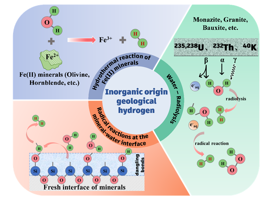 研究指出,含F(xiàn)e(II)礦物水熱反應(yīng)、水輻射分解以及礦物-水界面自由基反應(yīng)是無(wú)機(jī)來(lái)源地質(zhì)氫的三種主要形成途徑,其全球年產(chǎn)氫率分別為0.2×1011–6.3×1012 mol/year,1.6×1010–1.35×1013 mol/year,和1.1×108–2.5×1010 mol/year。含F(xiàn)e(Ⅱ)礦物水熱反應(yīng)的核心機(jī)制是Fe(II)的電子轉(zhuǎn)移與礦物相變,主要受溫度控制;水輻射分解則通過天然放射性元素輻照水分解生成氫,主要受輻射類型和劑量影響;而礦物-水界面自由基反應(yīng)主要來(lái)源于界面水分子在不飽和配位位點(diǎn)反應(yīng)形成自由基并進(jìn)一步生成氫氣,其主要受礦物類型控制。上述反應(yīng)還受到共存離子、水溶氣體等地質(zhì)環(huán)境條件的共同調(diào)控。