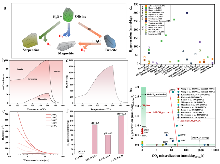 含F(xiàn)e(II)礦物的水熱反應(yīng)生成氫氣。(a)橄欖石水熱反應(yīng)生成氫氣的示意圖;(b)在 50 兆帕壓力和水巖比為 1 的條件下,隨著溫度變化預(yù)測(cè)的橄欖石水熱反應(yīng)中的平衡礦物組合;(c)在 50 兆帕壓力和水巖比為 1 的條件下,基于熱力學(xué)模型計(jì)算的橄欖石水熱反應(yīng)中氫氣生成量隨溫度的變化情況;(d)不同礦物在純水和氯化鈉溶液系統(tǒng)中氫氣生成量的比較;(e)在低水巖比(0.01)條件下,氫氣生成量顯著增加;(f)在不同 pH 條件下,輝長(zhǎng)巖熱液反應(yīng)產(chǎn)生的氫氣;(g)橄欖石熱液反應(yīng)過程中的氫氣生成及二氧化碳礦化