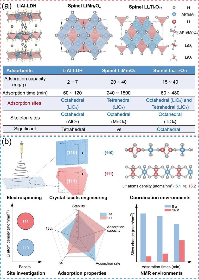 在提高吸附容量方面,研究團(tuán)隊(duì)通過(guò)表面配位環(huán)境(coordination environment)的調(diào)節(jié)策略,即不同晶面上四面體與八面體配位點(diǎn)分布的精確調(diào)控,實(shí)現(xiàn)對(duì)鋰離子吸附動(dòng)力學(xué)與容量的協(xié)同控制。同時(shí)揭示了鋰離子在材料中的遷移機(jī)制:鋰離子首先進(jìn)入四面體位點(diǎn)作為“擴(kuò)散入口”,隨后逐步遷移至更穩(wěn)定的八面體位點(diǎn)實(shí)現(xiàn)儲(chǔ)存。闡明了富含四面體位點(diǎn)的(110)晶面能夠降低鋰離子進(jìn)入材料結(jié)構(gòu)的能壘,使鋰離子快速進(jìn)入材料內(nèi)部,從而顯著提升吸附速率;而具有更均衡配位環(huán)境的(111)晶面則能夠提供更穩(wěn)定的鋰離子儲(chǔ)存位點(diǎn),從而實(shí)現(xiàn)更高的平衡吸附容量。該研究從原子尺度闡明了配位環(huán)境對(duì)鋰離子吸附行為的調(diào)控機(jī)制,為高容量吸附材料設(shè)計(jì)提供思路。
