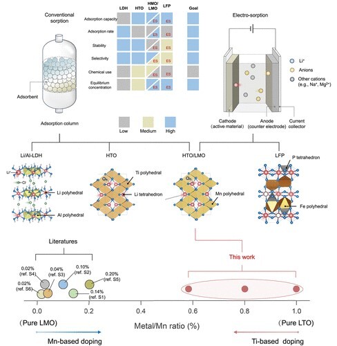 傳統(tǒng)鹽湖提鋰技術(shù)依賴(lài)太陽(yáng)能蒸發(fā)濃縮,具有成本低廉優(yōu)勢(shì),但先提鉀后提鋰工藝流程長(zhǎng),各階段鋰夾帶損失大,導(dǎo)致提高鋰收率成為鹽湖資源開(kāi)發(fā)的急切需求。近年來(lái),電控吸附技術(shù)在直接提鋰(Direct Lithium Extraction, DLE)上因其高效、綠色環(huán)保的優(yōu)勢(shì),成為鹽湖資源提取的重要發(fā)展方向。然而,在多離子競(jìng)爭(zhēng)環(huán)境下實(shí)現(xiàn)鋰離子的高選擇性、離子高速傳輸及材料長(zhǎng)期穩(wěn)定性,仍是該領(lǐng)域面臨的核心科學(xué)問(wèn)題。針對(duì)上述挑戰(zhàn),中國(guó)科學(xué)院青海鹽湖研究所劉忠研究員帶領(lǐng)的離子吸附科學(xué)與技術(shù)團(tuán)隊(duì),長(zhǎng)期致力于鹽鹵離子分離材料、工藝、和裝備的系統(tǒng)研發(fā)。團(tuán)隊(duì)在多類(lèi)吸附材料研究中,鈦吸附劑因離子選擇性高,鈦氧鍵結(jié)構(gòu)穩(wěn)定性好,其工業(yè)化前景十分廣闊。但在實(shí)際電控吸附過(guò)程中,如何提高離子和電子傳輸,同步實(shí)現(xiàn)高吸附容量和高電化學(xué)反應(yīng)速率,仍然是使用過(guò)程中面臨的難題。